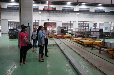 (總監在全亞洲第一條月產量5000T全自動立式氧化電泳線車間現場向貴賓介紹我司自動輸送線等先進設備)