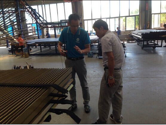(石副總在立式噴涂車間給貴賓介紹噴涂鋁型材多樣的顏色和精細的表面)