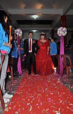 奮安大家庭為這個奮安小家庭送上了獨特的婚禮祝福:由奮安集團總經理黃秀華一家三口的“奔馳房車+奔馳車+寶馬”為主,10輛奮安獨具特色的業務車隊組成了喜慶、壯觀、獨特的迎親車隊;拍攝了“愛情童話”、“朋友祝福”、“父母期盼”、“小兩口幸福生活展望”等婚禮祝福視頻,向我們的新人送去了奮安兄弟姐妹們最真摯的祝福。黃總親臨婚禮現場為新人證婚,并要求“你倆要再接再厲,為我們的奮安儲備后續力量!”,讓全場的賓客都樂開了花。