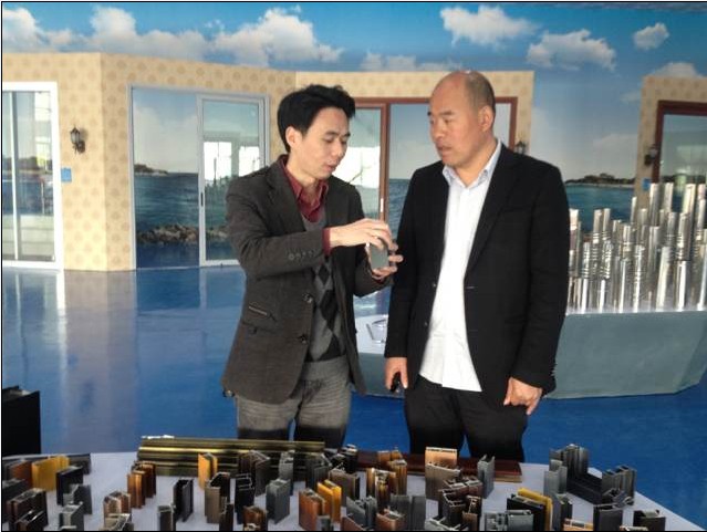 (在門窗體驗(yàn)中心,梁總向貴賓介紹奮安特色鋁單板)
